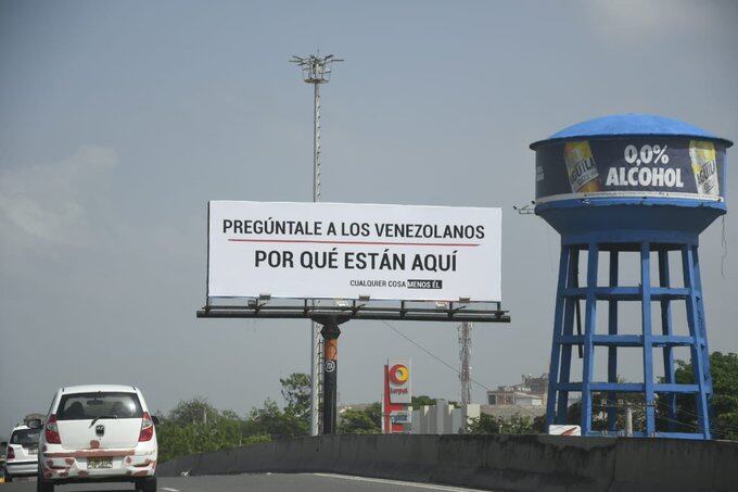 “Pregúntenle a los venezolanos por qué están aquí”, se lee en el aviso que en la capital del Magdalena fue ubicado en la Avenida del Ferrocarril con carrera 19. al final, en letra más pequeña, dice: “cualquiera menos él”.