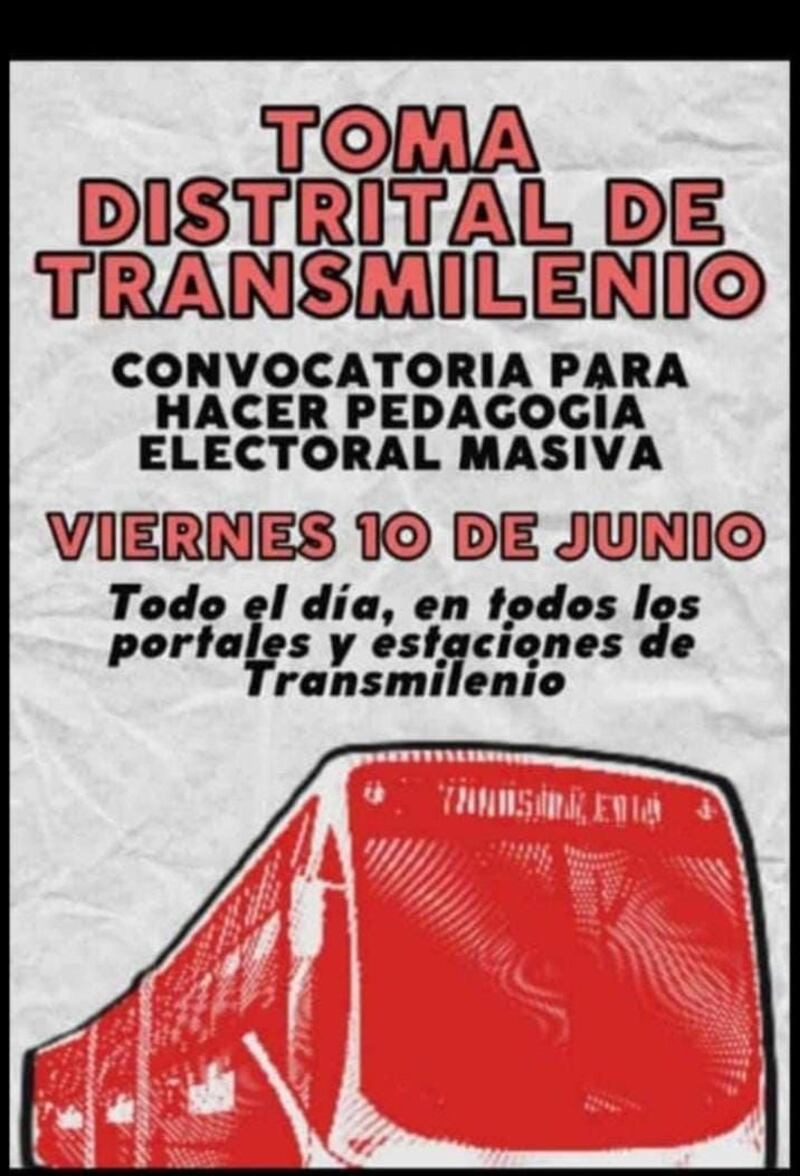 “Toma distrital de TransMilenio. Convocatoria para hacer pedagogía electoral masiva. Viernes 10 de junio. Todo el día, en todos los portales y estaciones de TransMilenio”, dice en un póster con una ilustración de un bus de TransMilenio que hace la convocatoria a la toma masiva.