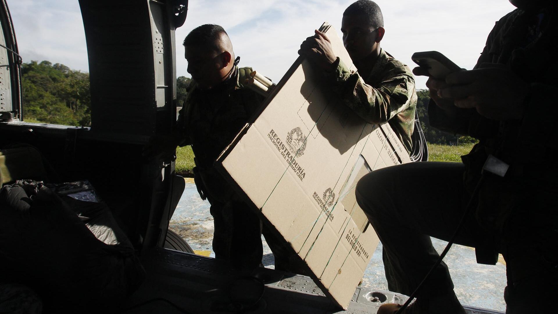 Como parte de una operación coordinada desde la base aérea de Rionegro, Antioquia, con tripulaciones integradas por cinco personas y utilizando helicópteros UH-60, el pasado jueves comenzó la entrega de material en largas jornadas que tuvieron en la geografía colombiana y el clima los principales desafíos para cumplir con los requerimientos de la Registraduría, organismo que organiza las elecciones.