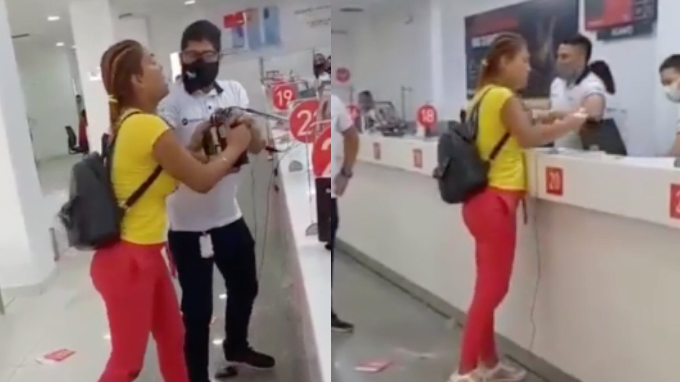 Como se observa en las imágenes, la mujer de camiseta amarilla discute con uno de los funcionarios cuando comienza a insultar a la empleada y agarrar el computador contra el mueble, destruyéndolo.