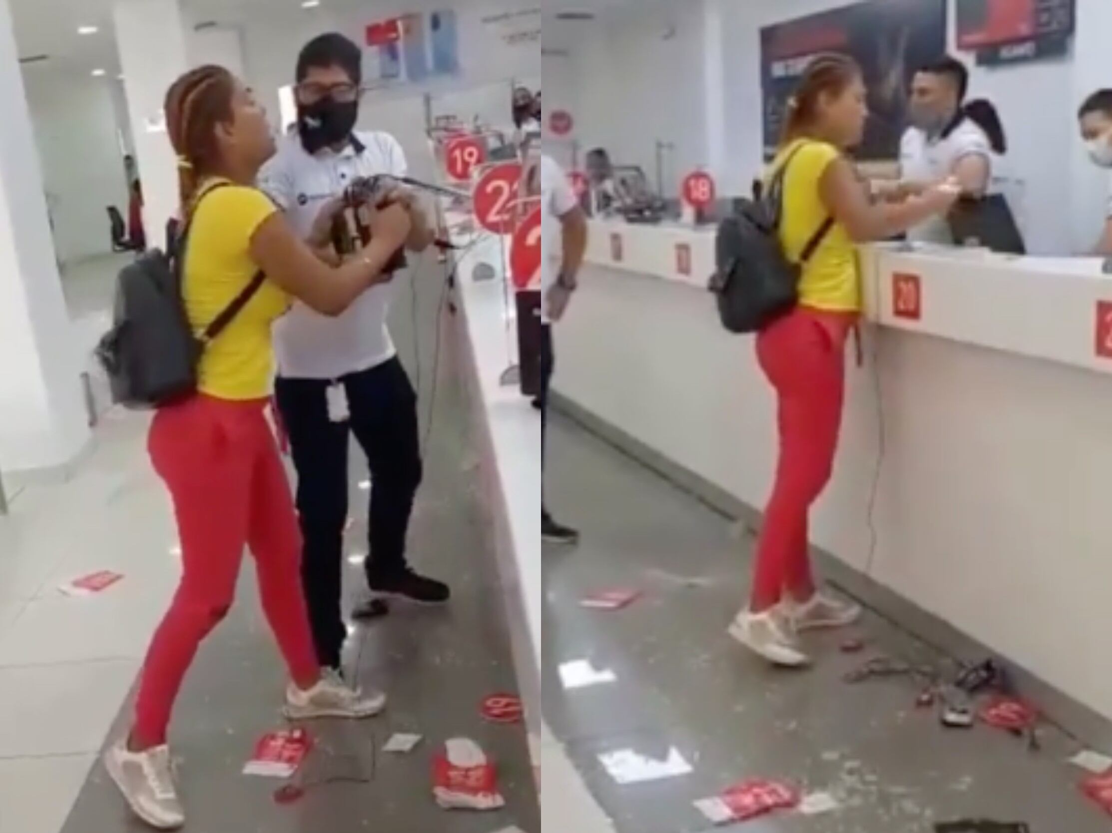 Como se observa en las imágenes, la mujer de camiseta amarilla discute con uno de los funcionarios cuando comienza a insultar a la empleada y agarrar el computador contra el mueble, destruyéndolo.