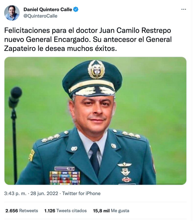 “Felicitaciones para el doctor Juan Camilo Restrepo nuevo General Encargado. Su antecesor el General Zapateiro le desea muchos éxitos”, fueron las palabras que compartió el alcalde en sus redes sociales, junto a un montaje de la cara de Restrepo en un uniforme militar.
