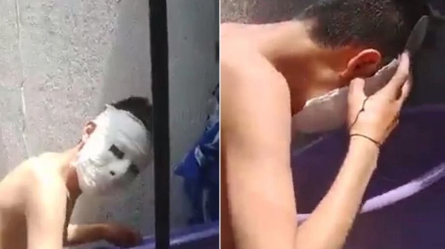 En las imágenes se ve al chico echándose agua para intentar ablandar el yeso, pero nada resultaba. Finalmente dijo que se iba a quedar sis cejas de tanta presión que estaba ejerciendo para quitarse la máscara.