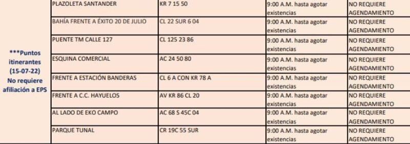 Recuerde que las muestras se toman hasta agotar las pruebas disponibles de la jornada. Los puntos habilitados para este viernes 15 de julio son: