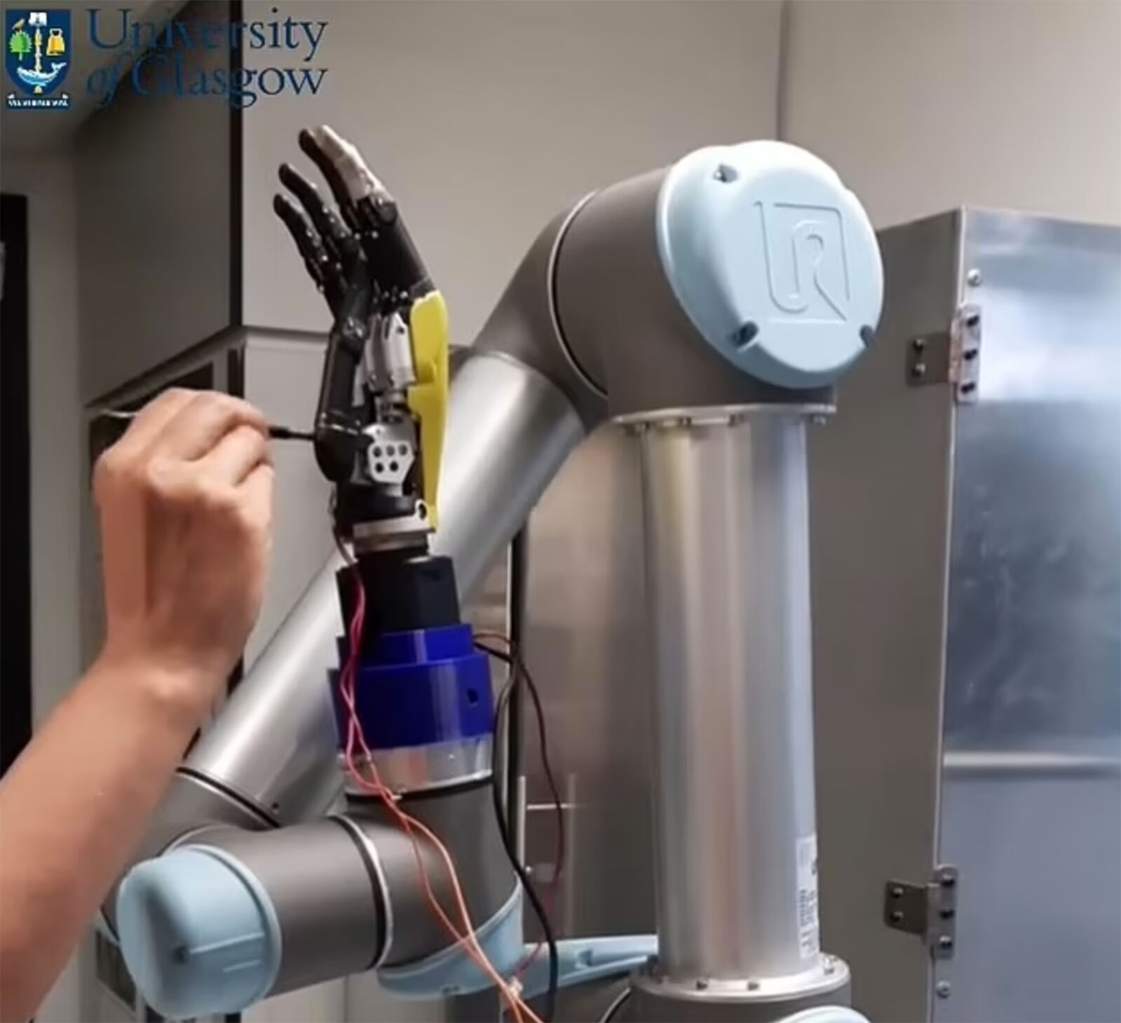 Después, los científicos del Bendable Electronics and Sensing Technologies (BEST) de la Universidad de Glasgow, dirigidos por el profesor Ravinder Dahiya, conectaron el transistor sináptico al sensor de la piel en la palma de una mano robótica totalmente articulada y con forma humana.