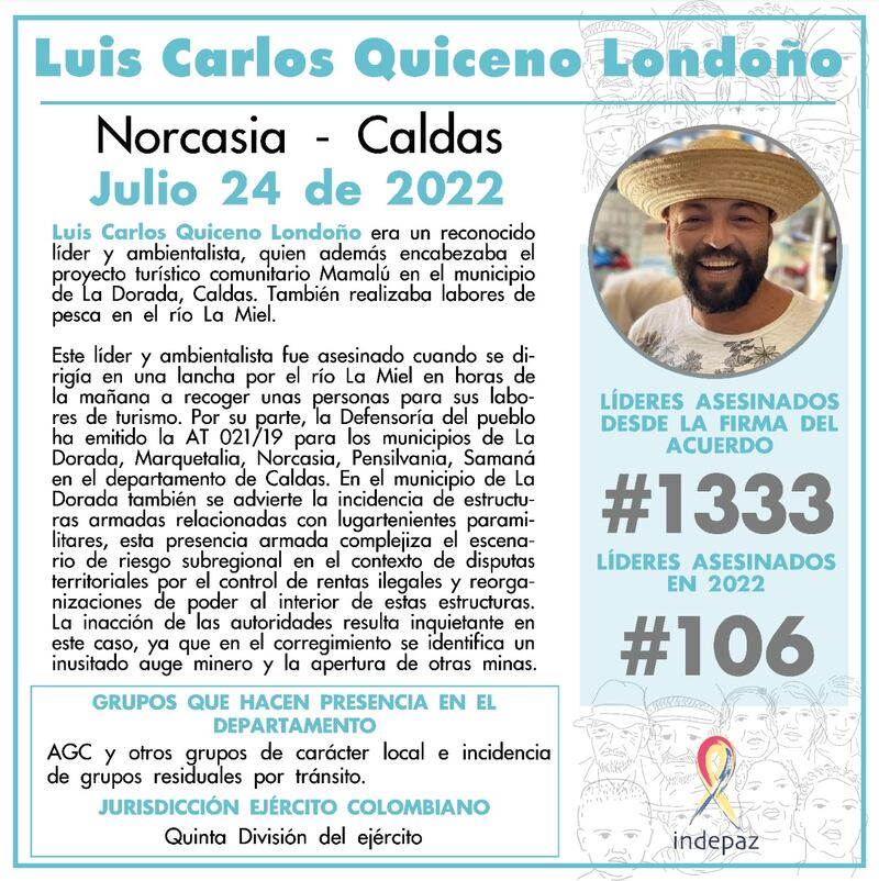 Horas antes también se conoció el asesinato de Luis Carlos Quiceno Londoño, un líder ambientalista que encabezaba un proyecto turístico en la población de la Dorada, Caldas.