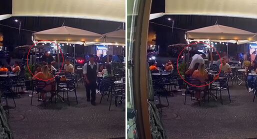 Los dos hombres quedan en shock, pero se vuelven a sentar en la mesa. La sorpresa llegó pocos instantes después, cuando aparece un presunto cómplice, vestido con camiseta blanca, que se acerca a la mesa y les entrega el reloj.
