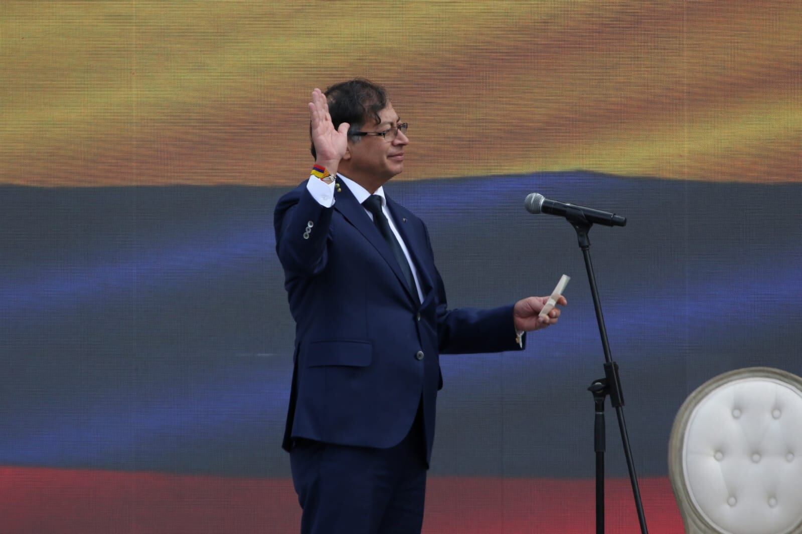 Junto a la mítica espada de Bolívar que mandó a traer segundos después de que se posesionó, el presidente Petro se dispuso a enunciar sus primeras palabras como presidente de la República, el primero de izquierda que tendrá el país, justo antes de caminar junto a su familia para hacer la entrada simbólica a la Casa de Nariño.