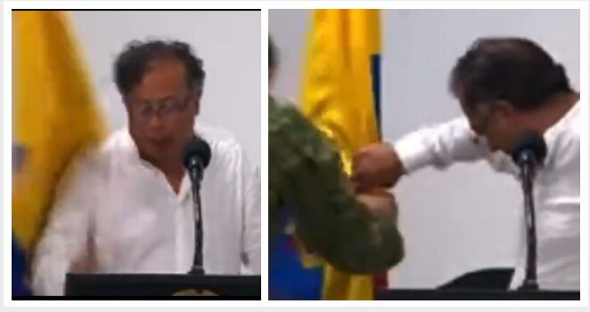 Un curioso video ha sido compartido en redes, en el que se puede ver, cómo le cayó la bandera de Colombia al presidente Gustavo Petro y se dio un totazo durante un acto público este jueves. Se conoció que el video fue grabado cuando un integrante del esquema de seguridad se desplomó, en medio de su discurso. La bandera del tricolor nacional cayó sobre el mandatario golpeando con el asta la cabeza del jefe de Estado, en el Amazonas.