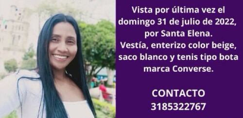Leidy Andrea Restrepo Góez, de 46 años, desapareció desde el domingo 31 de julio cuando salió de su casa para asistir a una ceremonia espiritual en la vereda El Plan del corregimiento de Santa Elena en Medellín. De acuerdo con los familiares, salió del sector de Calasanía, en el occidente de la capital antioqueña, sobre las 9 de la mañana y desde ese momento se le perdió el rastro.