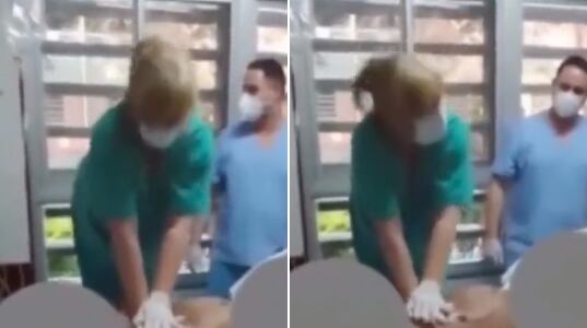 En las imágenes se observa como una de las médicas trata de reanimar a un paciente, pero todos a su alrededor hacen comentarios y bromas. Se escucha la voz de un hombre que se dirige a la doctora diciendo: “con los brazos firmes doctora, no tiene que flexionarse”, a lo que ella responde: “No los tengo flexionados”, mientras continúa con la maniobra.