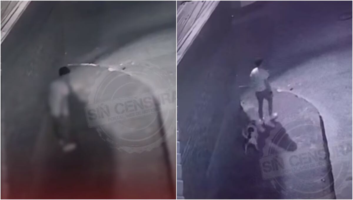 En las imágenes se evidencia al sujeto que observa que no haya personas en el sector para proceder a bajarse los pantalones, ponerse de rodillas contra el suelo y luego llamar al perro que estaba en el sector.
