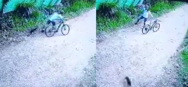 Los hecho sucedieron en zona rural del municipio y quedaron registrados en un video de una cámara de seguridad, en la que se ve la imprudencia de un hombre que se transporta en bicicleta, que se desespera con los ladridos de dos perros que lo persigue cuando pasa por allí.