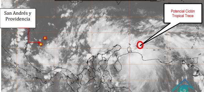 Un potencial ciclón tropical ‘Trece’ amenaza a San Andrés y Providencia de acuerdo al Ideam. La entidad informó este jueves que el ciclón Trece ubicado en el oriente del mar Caribe en una zona de baja presión continúa su desplazamiento hacia el occidente, con vientos sostenidos de 55 kilómetros por hora.