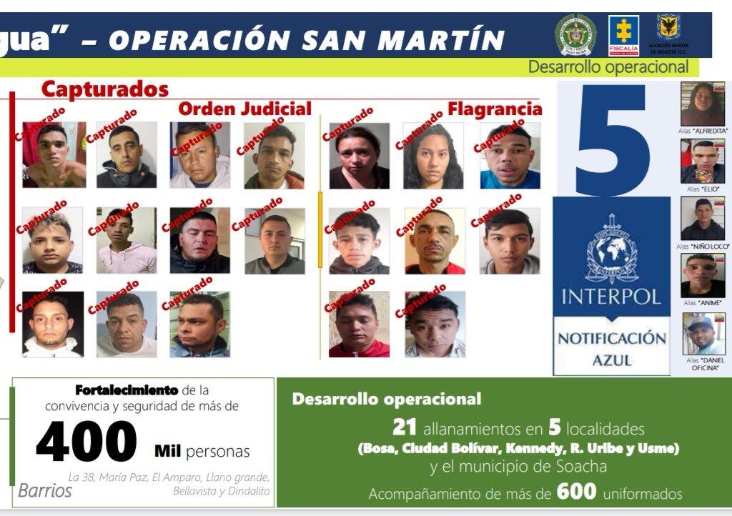 En total se realizaron 21 diligencias de allanamiento en las localidades de Bosa, Ciudad Bolívar, Kennedy, Rafael Uribe, Usme y el municipio de Soacha (Cundinamarca), donde se hicieron efectivas 11 capturas por orden judicial y 8 en flagrancia por los delitos de homicidio agravado, concierto para delinquir, extorsión, cohecho, así como tráfico, fabricación y porte de armas de fuego.