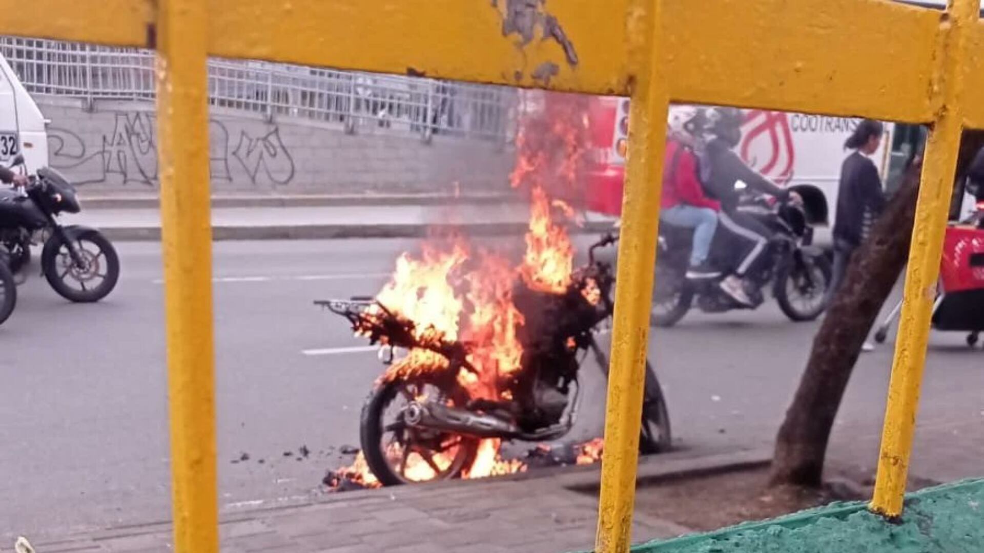 En redes sociales, se compartió este viernes un video, donde se ve una motocicleta completamente incendiada en la avenida del Ferrocarril, a la altura de la plaza Minorista, en el centro de Medellín, Antioquia.