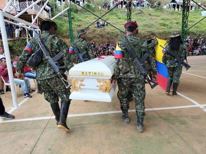 Ahora se conoció un video que habría sido grabado en la mañana de este jueves 3 de noviembre, en el norte del Cauca, donde se ve a la comunidad reunida en un polideportivo que, aparentemente, este excabecilla ordenó construir. Ahí, ante la mirada de todos, aparecieron los disidentes de las Farc con un ataúd blanco en hombros y con letras doradas se leía el nombre de ‘Mayimbú'.