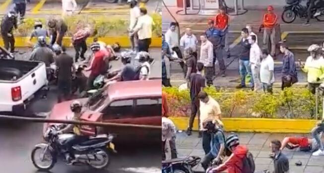 Estos fueron atrapados abordo de una moto por la comunidad y golpeados sin piedad ante incluso la petición de quienes grabaron el video. Con cascos de motos, patadas y otros objetos contundentes, un sujeto de chaqueta azul y otro con prendas rojas recibieron fuertes golpes de conductores, taxistas y motociclistas que se congregaron en una estación de gasolina.