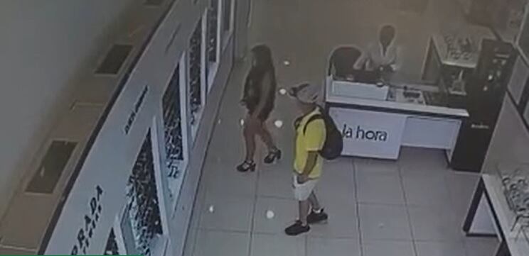 En cuestión de segundos despistan a la vendedora mientras el hombre toma dos lentes y cuando empieza a preguntar por el precio en dólares de un par se embolsilla el otro par en su bermuda.