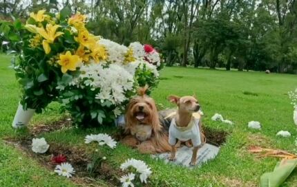 Uno de los perrito se puede ver acostado sobre la tumba y con la cabeza baja, mientras que el otro con ojos tristes, aprecia el panorama. En las imágenes se puede ver que Mauricio y Marleny descansan en la misma tumba y ambos perritos tienen una foto juntos en una tarjeta que fue dejada en la misma.