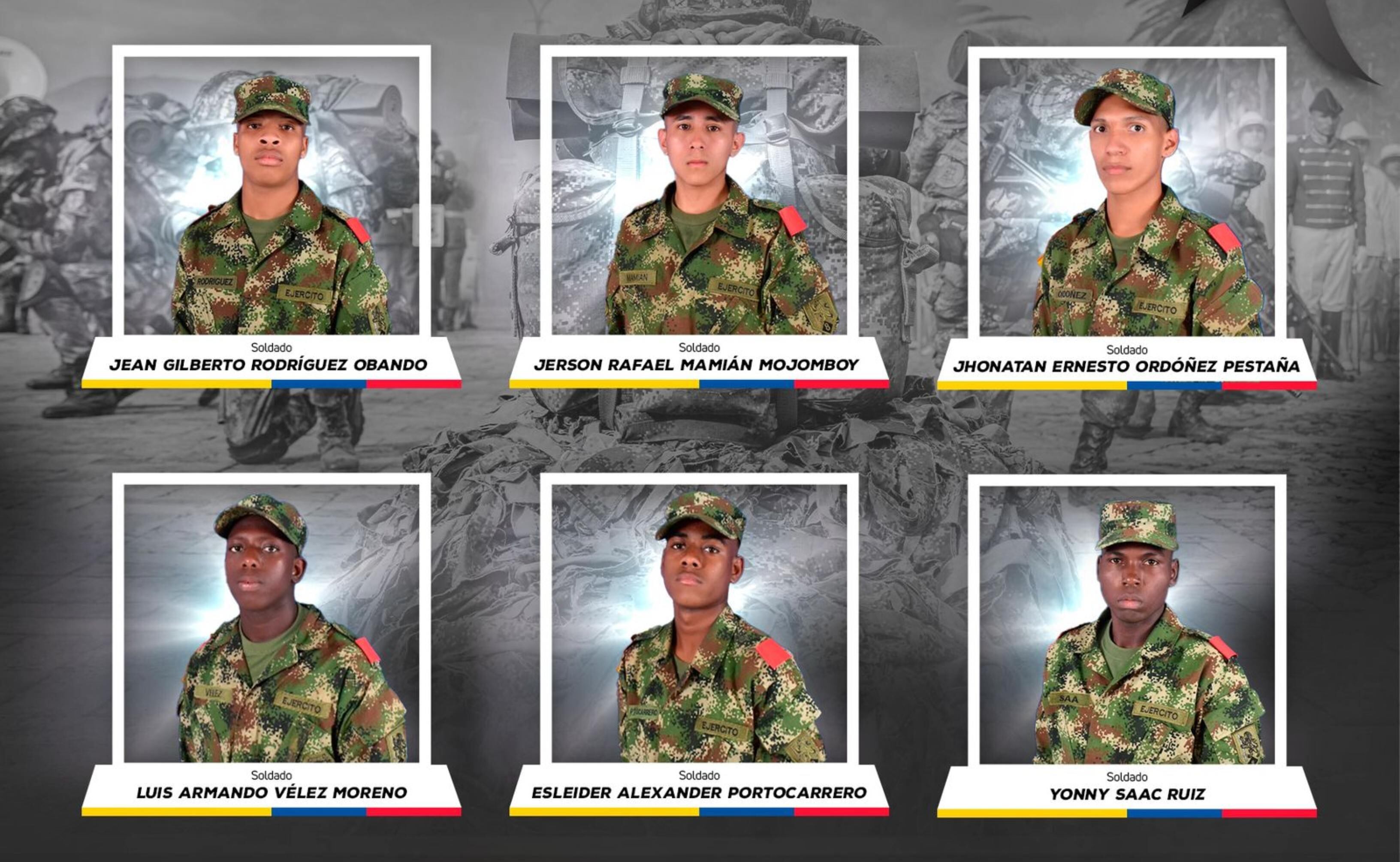 Los uniformados que perdieron la vida en la madrugada del 6 de diciembre en una zona rural de Buenos Aires, son: Yonny Saac, Jonathan Ordóñez, Armando Vélez, Jan Rodríguez, Jerson Mamian y Alexander Portocarrero, todos ellos de entre 18 y 20 años.