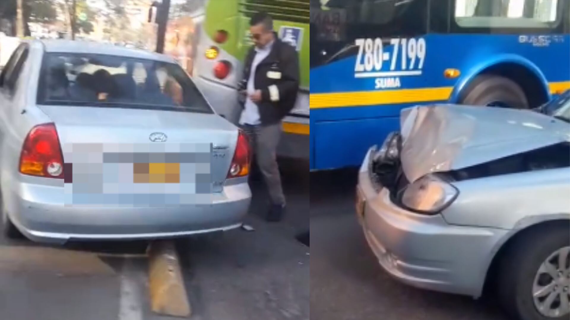 En la grabación subida a la plataforma TikTok, se evidencia como un bus dual de Transmilenio, fue impactado por un carro gris marca Hyundai, de placas MNE 496.