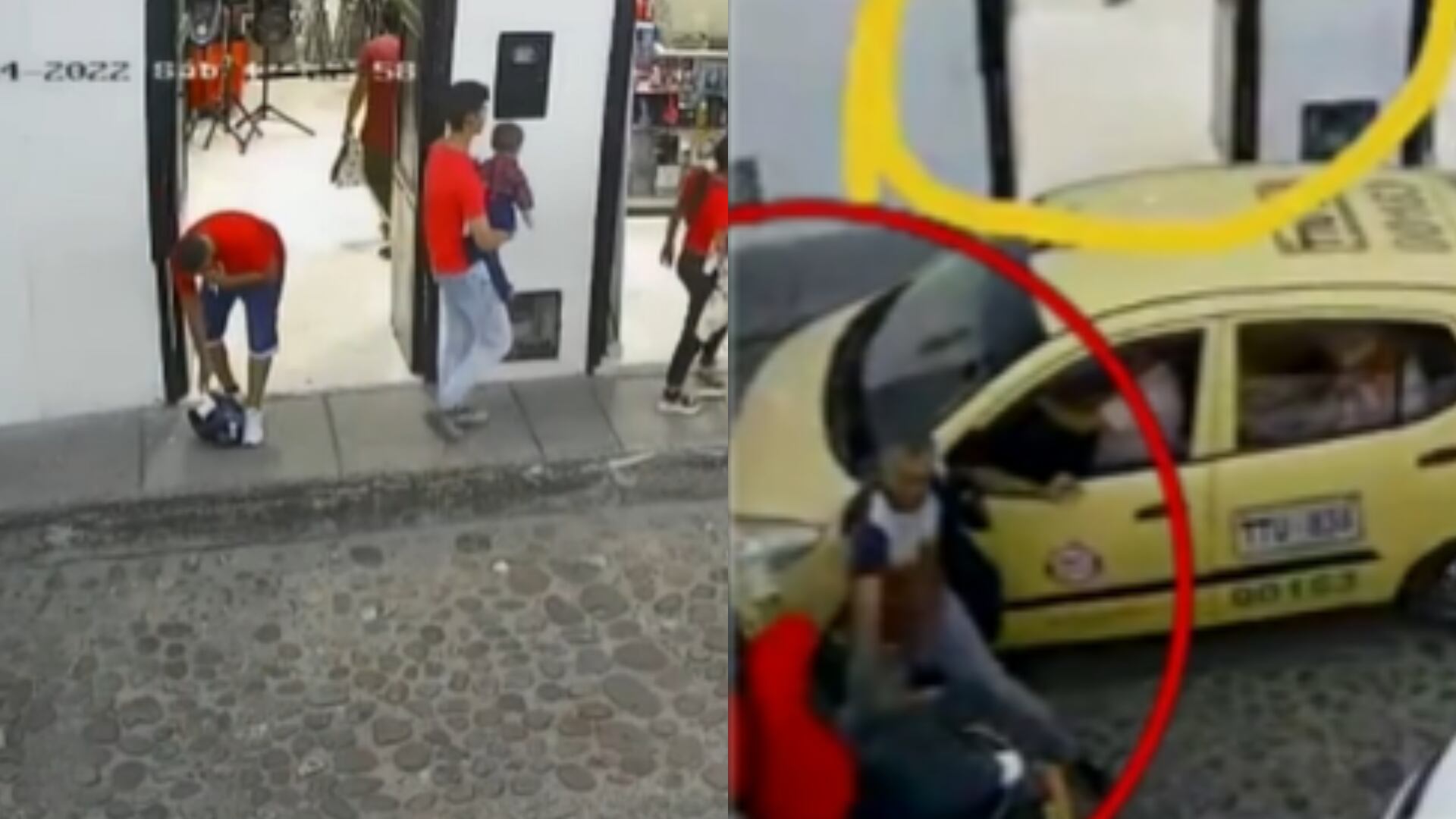 Cuando pareciera que el altercado finaliza, pues el transeúnte se sienta sobre la acera revisando su maleta, y el hombre de camiseta roja que va en compañía con una niña tiene la intención de subirse a la moto, nuevamente discuten.