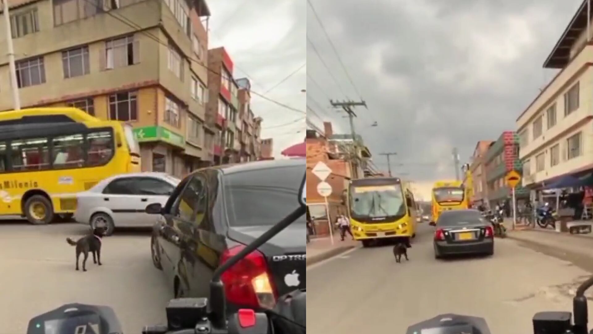 Mientras tanto, el animal persigue al automotor que estaba en movimiento, zigzagueando entre motos, camiones y buses con el riesgo de ser atropellado.