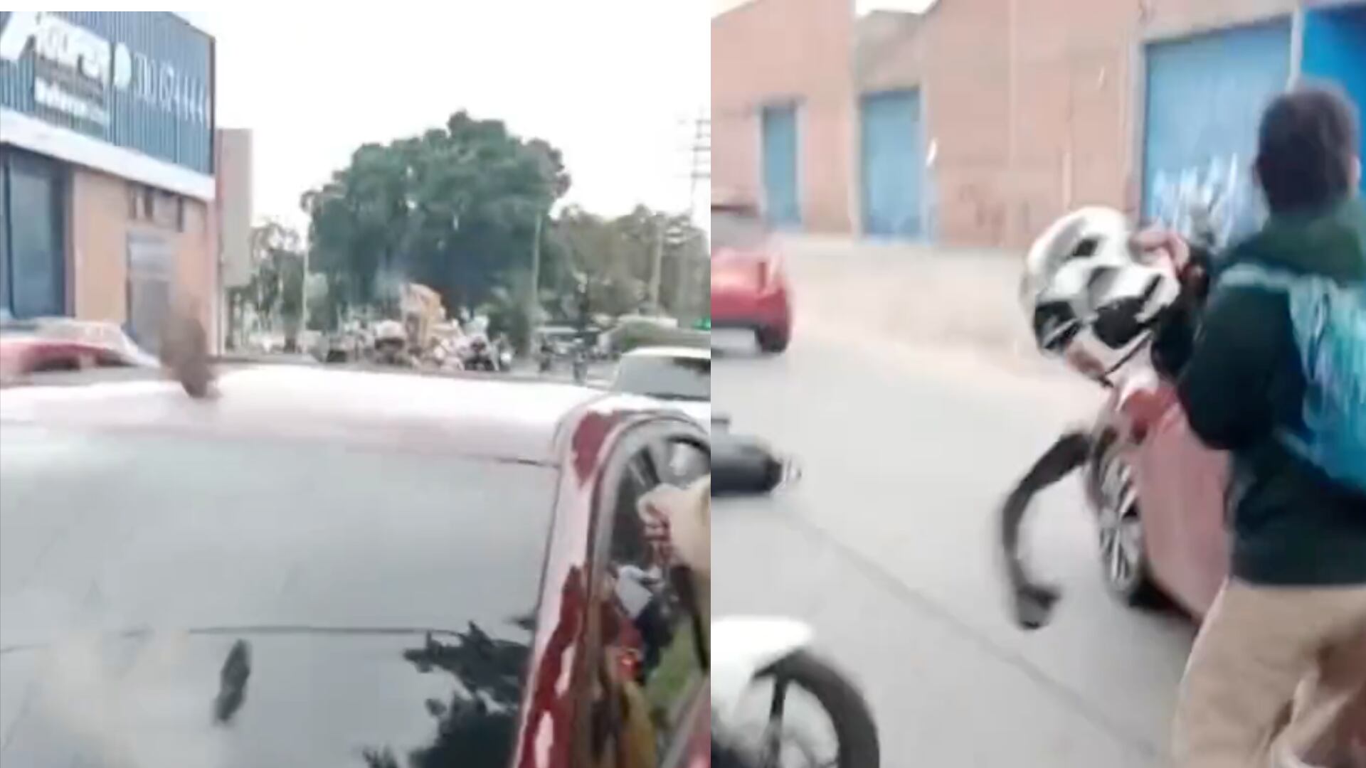 En la escena, se ve a un agente de tránsito de la ciudad que atiende el llamado, mientras, furiosos, varios ciudadanos golpean con su casco y hasta con piedras el carro involucrado en el accidente.