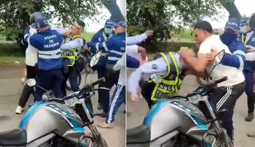 En las imágenes que se conocieron a través de las redes sociales, se observa que dos agentes de tránsito sostienen la motocicleta de un hombre de camiseta blanca, mientras este discute con ellos para evitar que le pongan una multa; sin embargo, en medio de la discusión, el sujete le lanza un golpe en el rostro a uno de los uniformados.