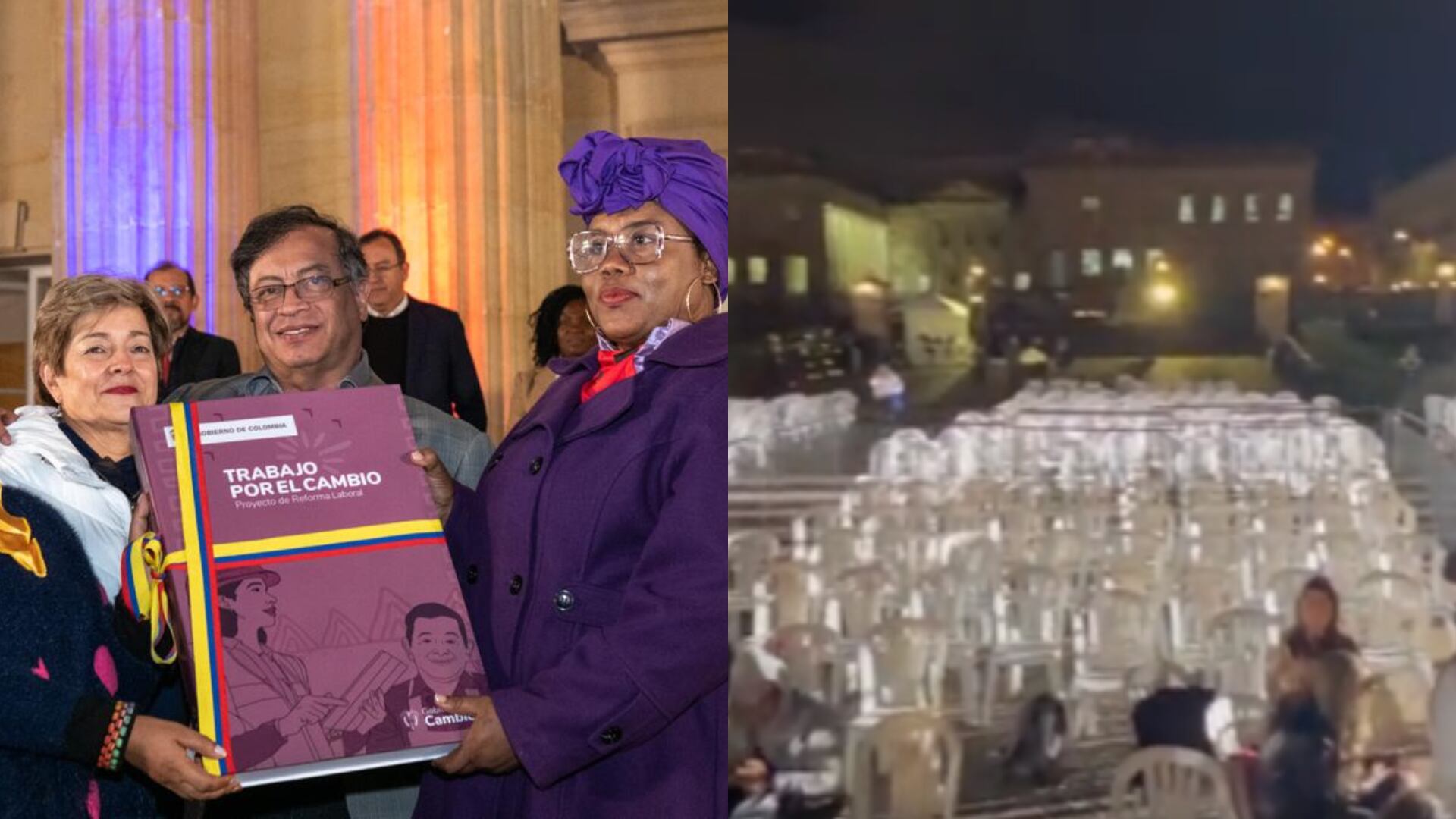 En horas de la tarde de este jueves, cientos de personas se congregaron en el Parque Nacional para llegar hasta la Plaza de Armas en el centro de Bogotá, en apoyo a la radicación de la Reforma Laboral. Sin embargo, la cita que estaba pactada para las 5pm, se alargó por cerca de cinco horas. Por lo que los simpatizantes del gobierno, decidieron empezar a marcharse y las sillas vacías empezaron a notarse.