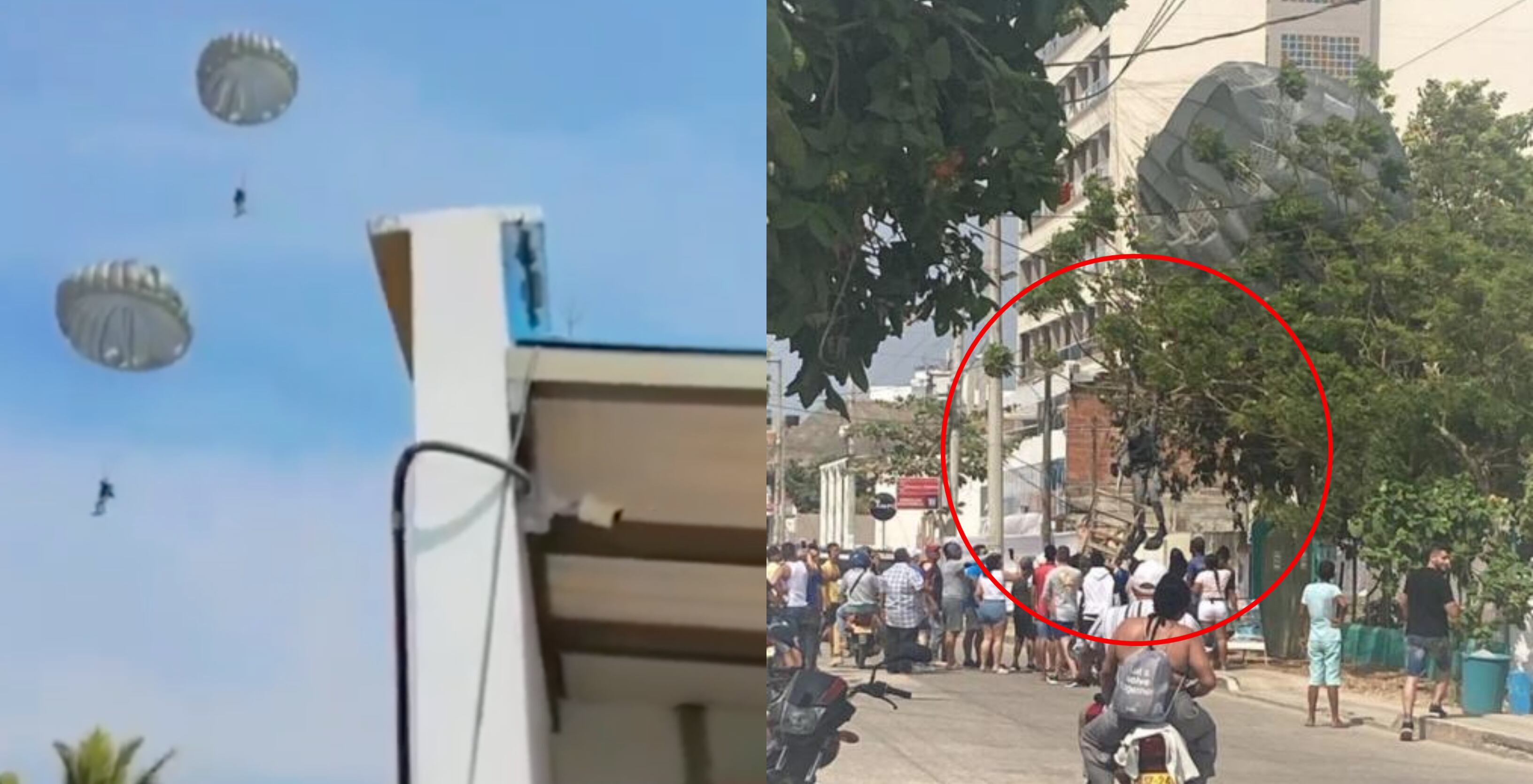 Varios videos que circulan en redes sociales muestran el accidente de varios paracaidistas de la Fuerza Aérea Colombiana (FAC) que por un fuerte viento terminaron aterrizando en la zona residencial de Coveñas y no en la playa, como lo tenían planeado.