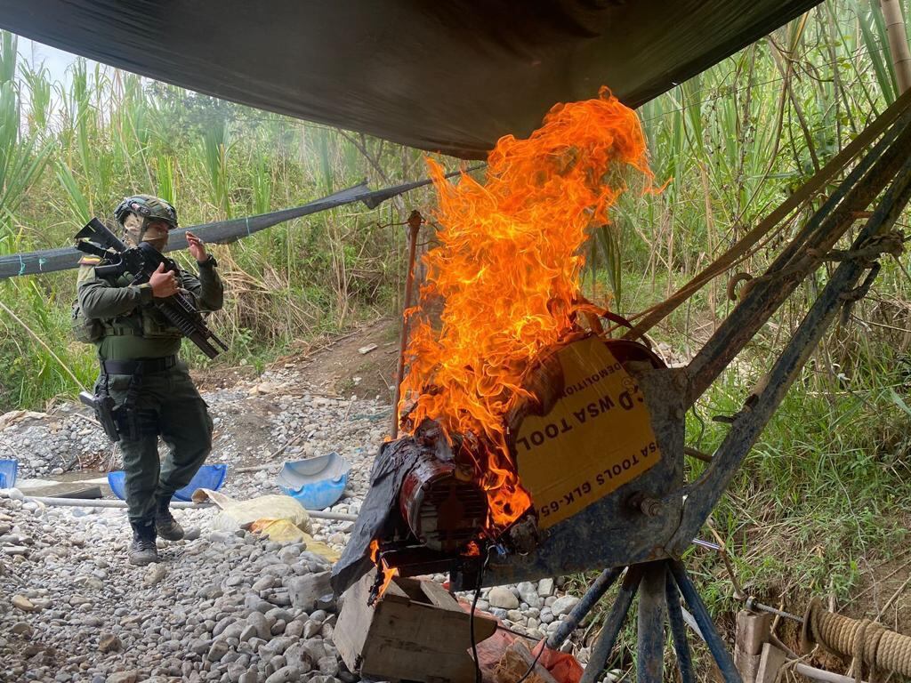 Ahí, destruyeron la maquinaria que “tiene un costo aproximado de ocho mil millones de pesos, donde se producían más de 33 mil gramos de oro, equivalentes a más de diez mil millones de pesos que dejaron de percibir estos grupos al margen de la ley por la comercialización de ese metal”, indicó el Ejército.