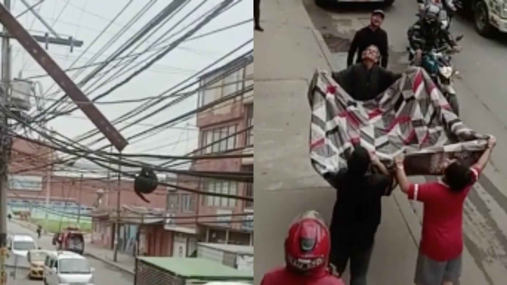 En unas imágenes que se viralizaron recientemente, un felino de color negro evitaba caer al precipicio, colgado sobre algunos cables de alta tensión. Al percatarse de la escena, vecinos del barrio Patio Bonito se armaron de una cobija para que el gato cayera sobre la misma y no se lastimara.
