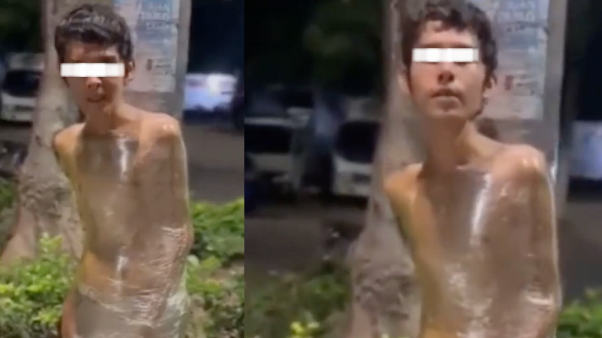 Una vez fue capturado, las personas decidieron envolver al hombre en papel vinipel. Material utilizado para guardar alimentos, proteger y hasta inmovilizar todo tipo de objetos. Asimismo, aprovecharon para sacar los teléfonos celulares para grabar la ‘bochornosa’ escena.