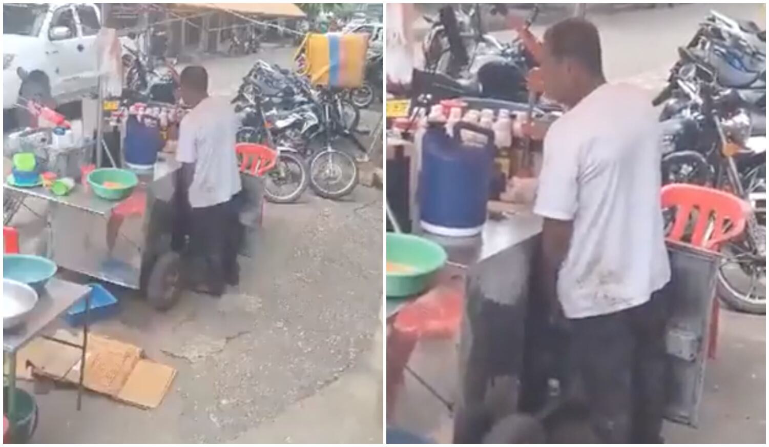 No se sabe en qué parte del país grabaron al hombre, pero en las imágenes se aprecia un puesto de comida en medio de una calle donde están parqueadas muchas motocicletas y junto al sujeto lo que serían varios termos de café o de algún otro líquido.