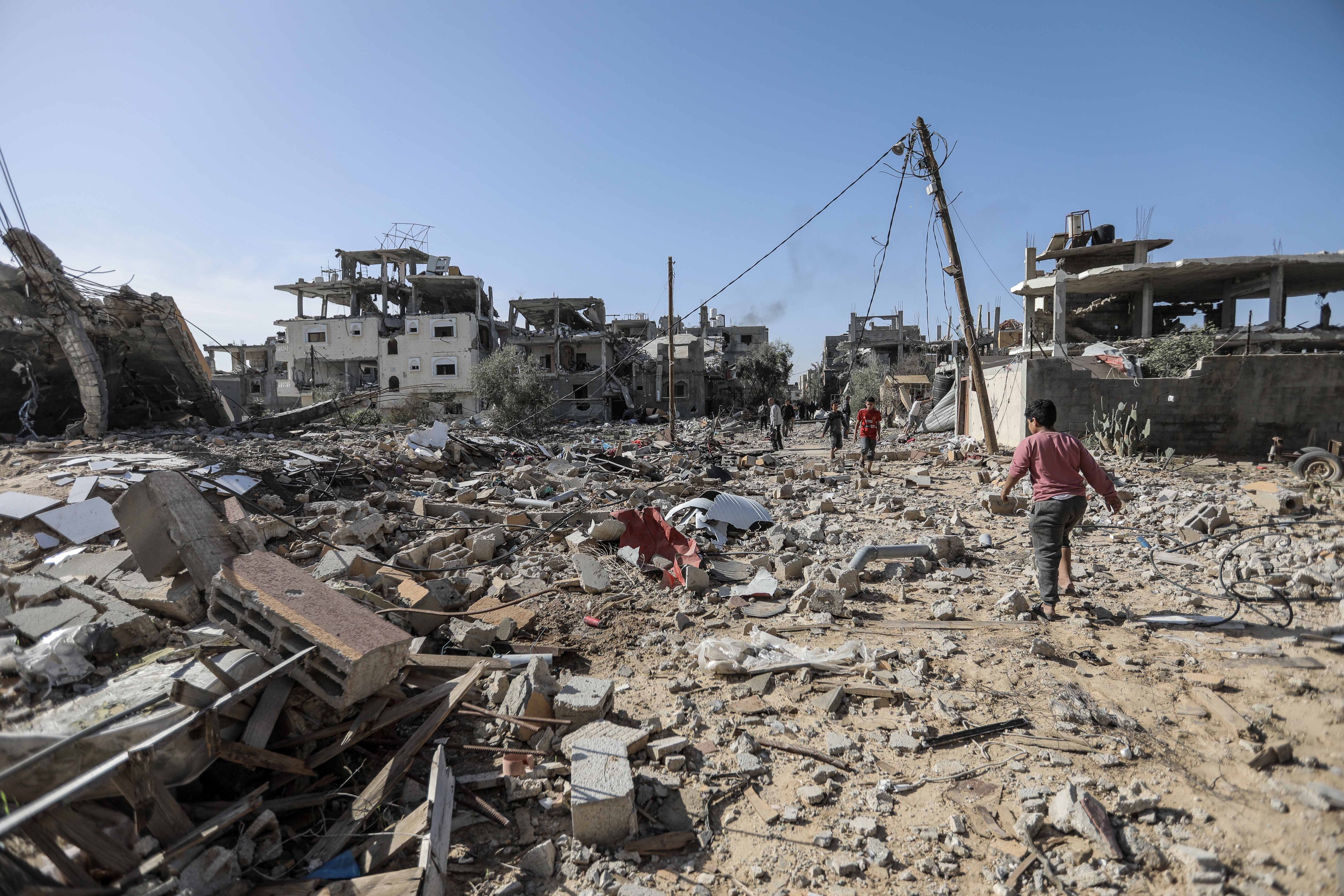 Israel-Hamas Truce: Displaced Palestinians Return To Destroyed Homes As Aid Trickles In From Egypt KHAN YUNIS, GAZA - NOVEMBER 24: Palestinian citizens inspect the effects of destruction caused by air strikes on their homes in the Khuza’a area on November 24, 2023 in Khan Yunis, Gaza. Palestinians who had taken refuge in temporary shelters returned to their homes as a four-day ceasefire began between Israel and Hamas this morning, although Israeli forces remain in Gaza. A total of 50 hostages currently held by Hamas are to be released during the temporary truce, the first such pause in fighting since Oct. 7, when Hamas launched its surprise attack and Israeli responded with a vast military offensive to destroy the militant group that governs Gaza. Under the deal, 150 Palestinian prisoners are also to be released from Israel, and more humanitarian aid will be admitted at the Gaza-Egypt border crossing. (Photo by Ahmad Hasaballah/Getty Images) (Ahmad Hasaballah/Getty Images)