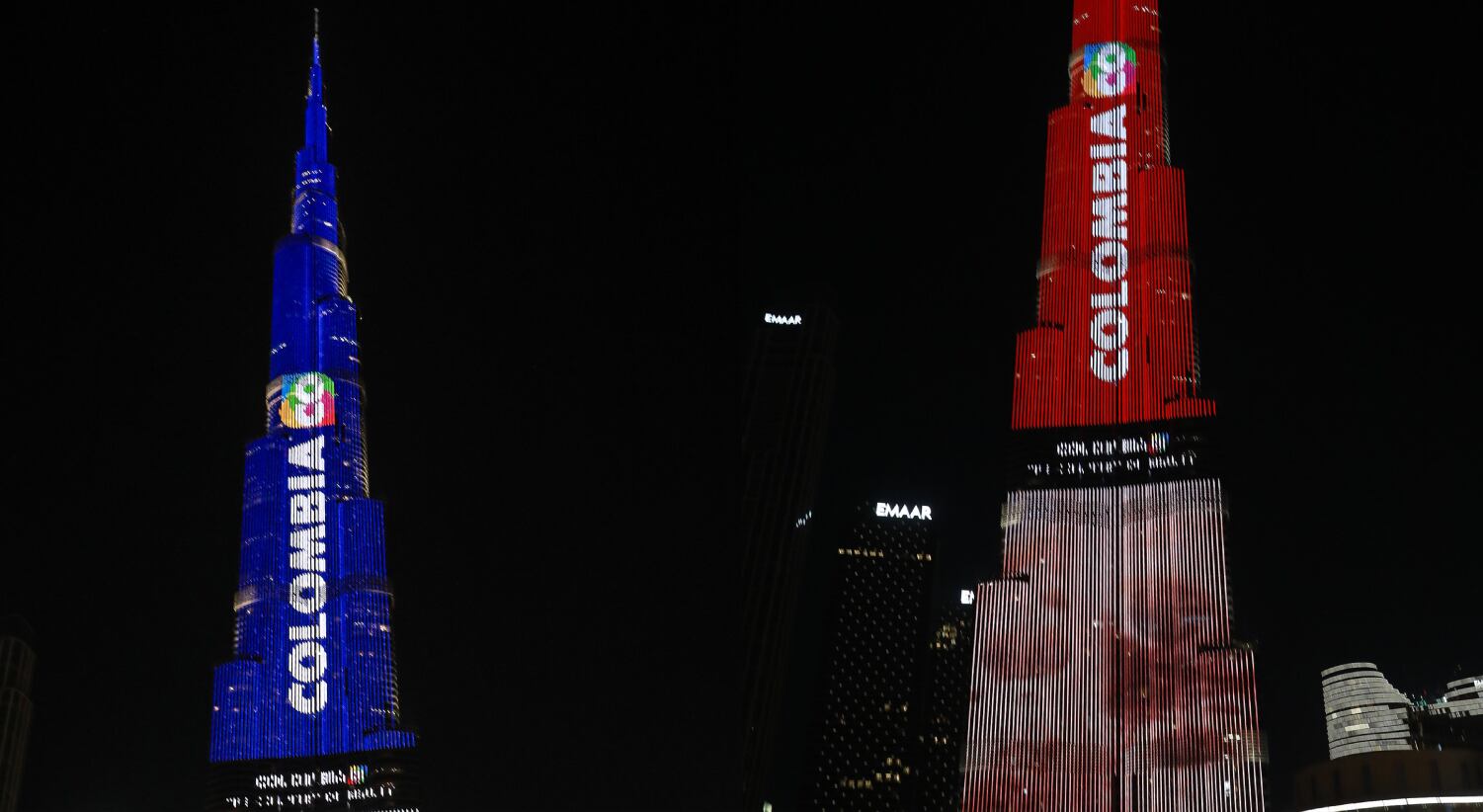 Durante varios minutos en Dubái se pudo ver la bandera de Colombia desde el rascacielos más alto del mundo, el Burj Khalifa, que cuenta con 828 metros de altura. Así como sucede en la Torre Colpatria, en Bogotá, el Gobierno Nacional llevó un video promocional de ‘Colombia, el País de la Belleza’ para que lo transmitieran en las paredes de este edificio.