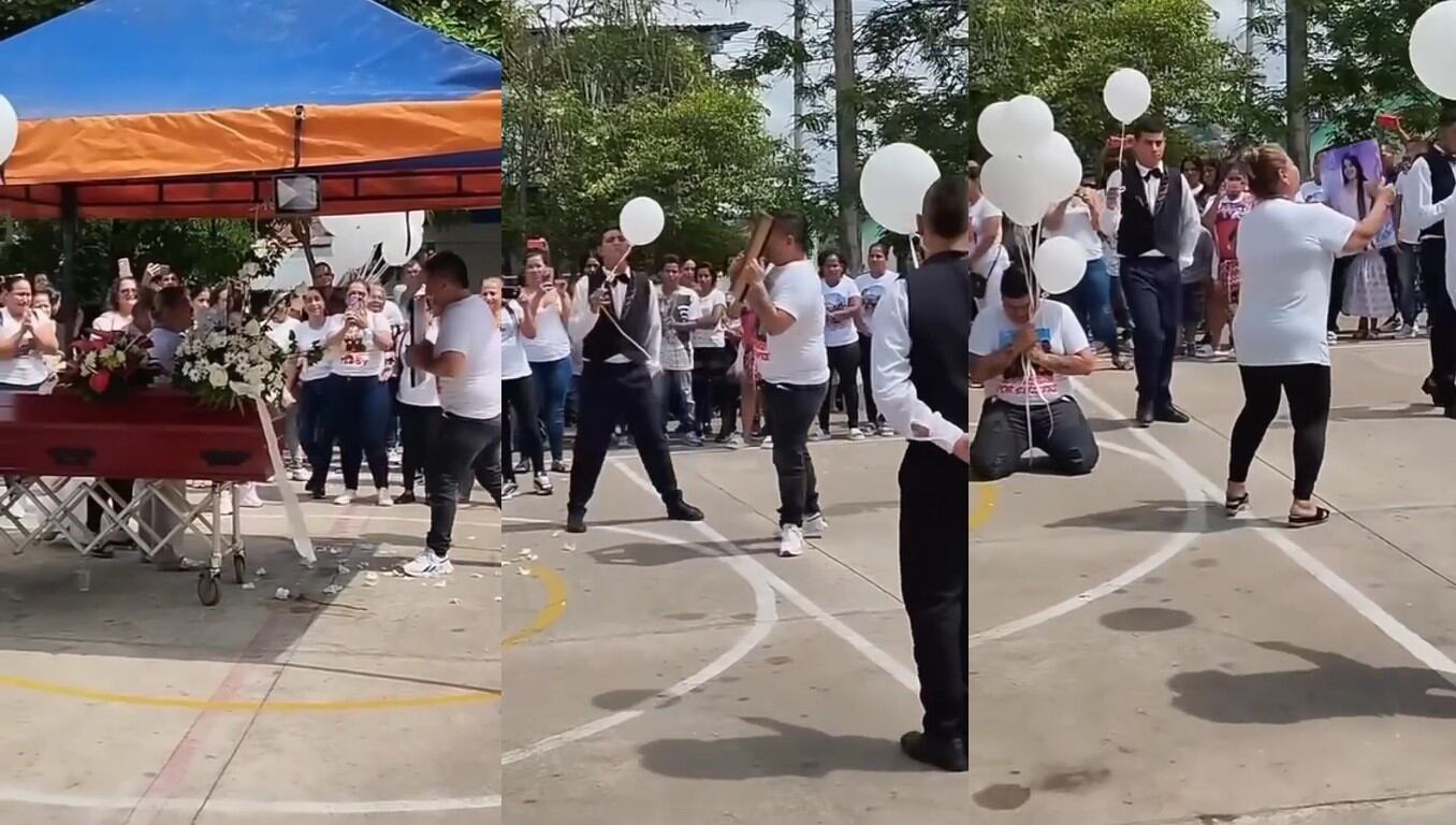 En las dolorosas imágenes que empiezan a ser virales en las redes sociales se ve a seis chambelanes sostener cada uno un globo blanco mientras que el padre de Laurent Michelle Lizcano Sánchez baila en medio de lágrimas con el retrato de la joven.