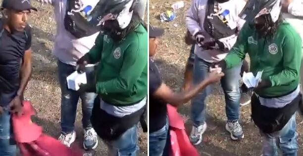 En las imágenes se observa que el sujeto al que le llegan a cobrar también se queja por la llegada inoportuna de sus cobradores, pero ante el momento no tiene más remedio que sacar el dinero del bolsillo y pagar.