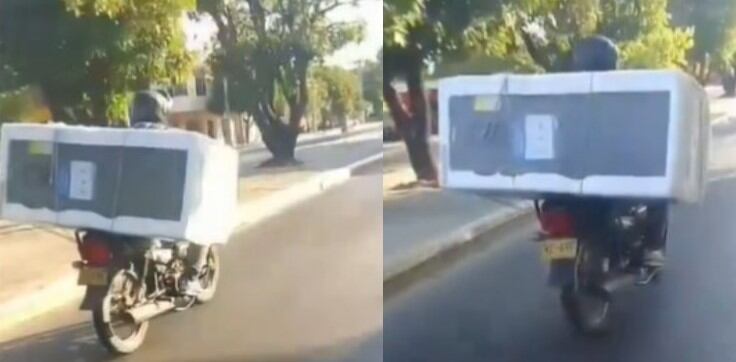 Este insólito caso ha sido compartido en redes sociales a través de un video. Un mototaxista sin ningún tipo de temor y a toda velocidad trasteó una enorme nevera detrás de su vehículo.