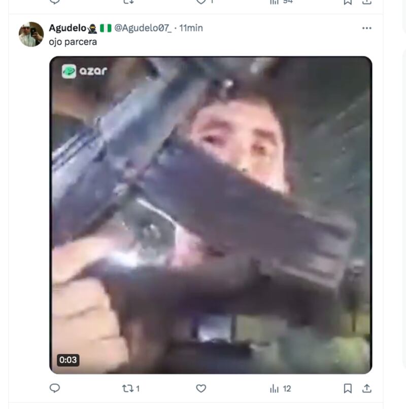 “Ya sabemos dónde vamos a llegar el combo de 70 está activo y cuida a tu novio”, le dijo una persona con el usuario de X @lyan_aL77. “Ojo, parcera”, le comentó el usuario @Agudelo07_, quien adjunto un video de un hombre con un fusil. “Cuidadito en la calle no vaya ser que te fulminen ese pecho”, le dijo otro usuario llamado @jonxtan_. “Ay, amor, no se deje ver”, le dice otra persona con el usuario @MiguelG83174197 que subió otra imagen con hombres armados.