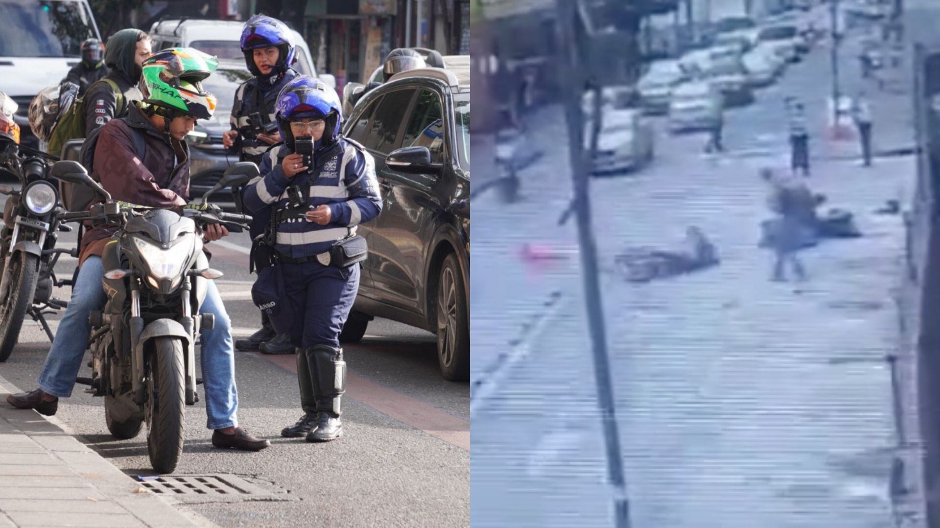 Tras hacerle el respectivo aviso para que se detenga, el sujeto intentó omitir este requerimiento, lo que desencadenó la desorbitada reacción del agente tirándole un cono a quema ropa y causando que el conductor caiga aparatosamente del vehículo, deslizandose por varios metros.
