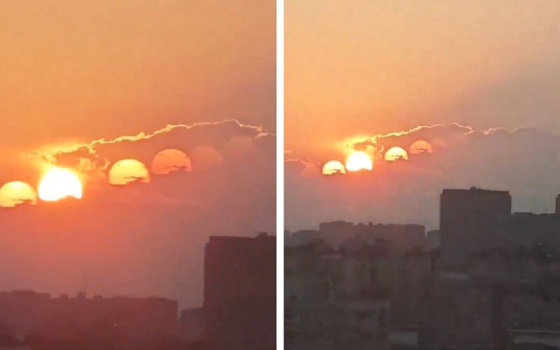 Se trata de una ilusión óptica rarísima que resulta de la combinación de varios fenómenos atmosféricos, principalmente la refracción y la dispersión de la luz solar. Estos fenómenos alteran la percepción visual, creando imágenes multiplicadas del Sol en el
