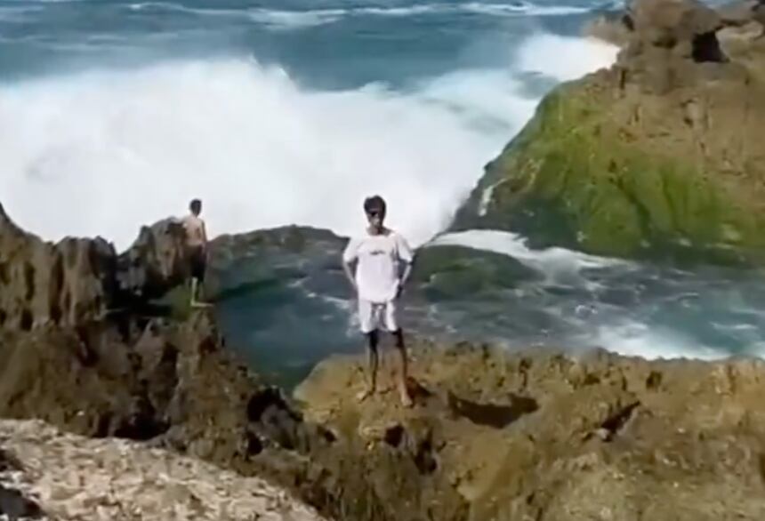 El joven estaba posando con los brazos extendidos cuando, de repente, una ola gigante lo golpeó y lo arrastró hacia el mar abierto. Sus amigos, inicialmente despreocupados, pronto entraron en pánico al ver que las fuertes corrientes lo alejaban de la costa.