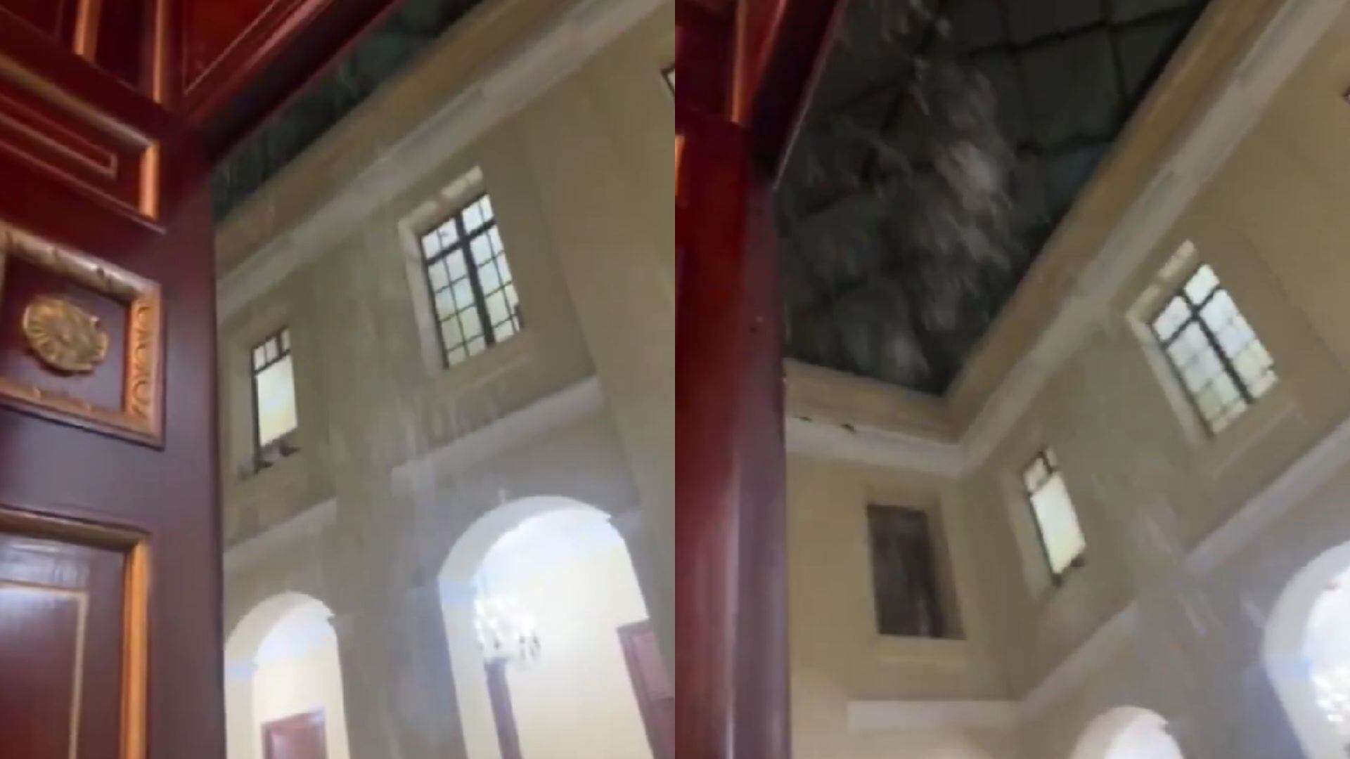 En las imágenes, que pronto se volvieron virales en las redes sociales, se ve cómo varios congresistas y funcionarios del recinto se refugian al margen de las aguas mientras esperan que el agua deje de caer del techo.