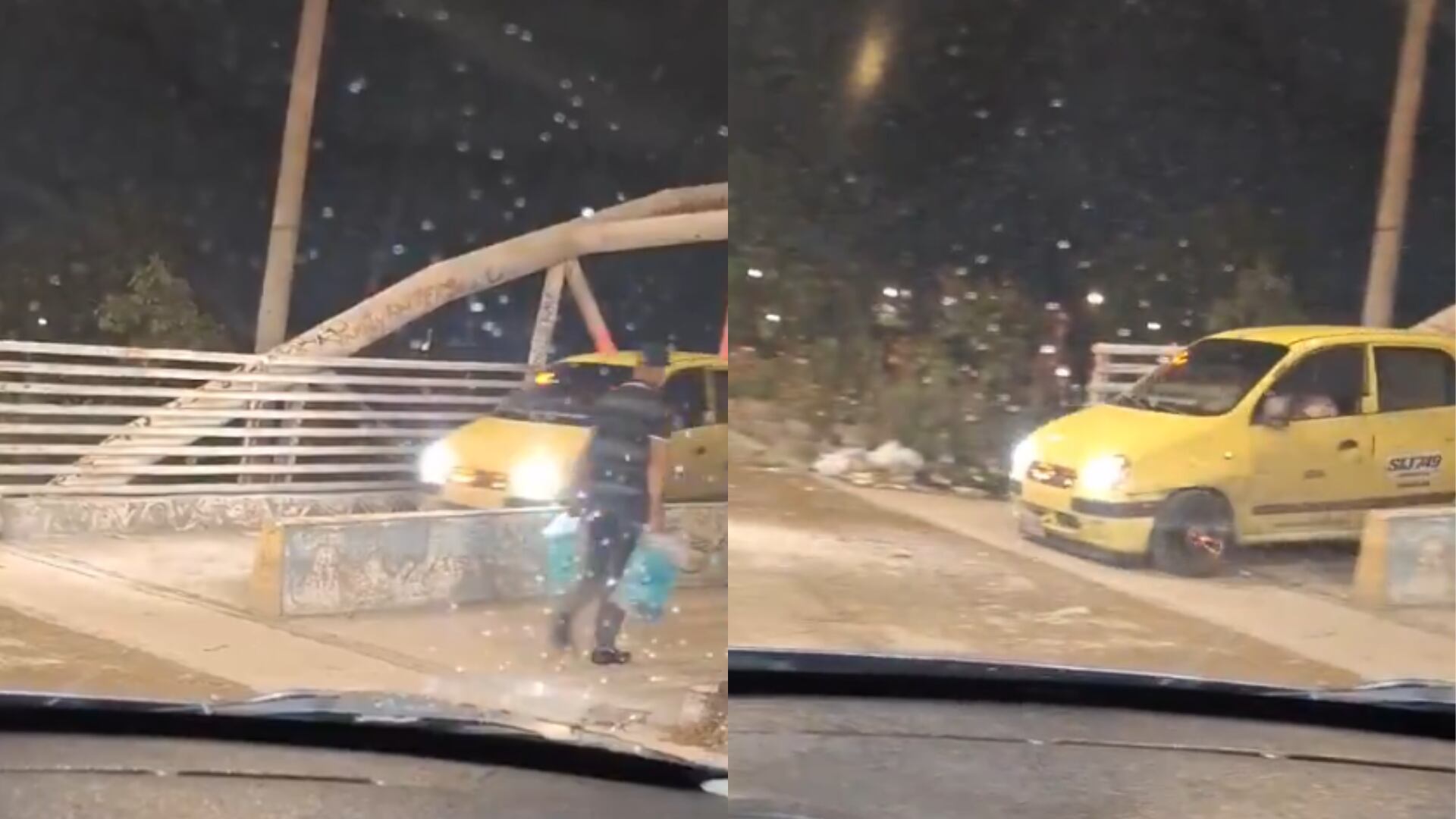 El vídeo deja ver como el conductor del taxi de placas SKJ - 749 prefirió mandar el carro por un puente peatonal, sin importarle que habían personas viéndolo y grabándolo, además, sin tampoco importarle que iban algunas personas pasando a pie por este puente peatonal. El conductor del taxi pasa rápido, ni siquiera se fija en si venían personas caminando o vehículos pasando y escapa a toda velocidad del lugar.