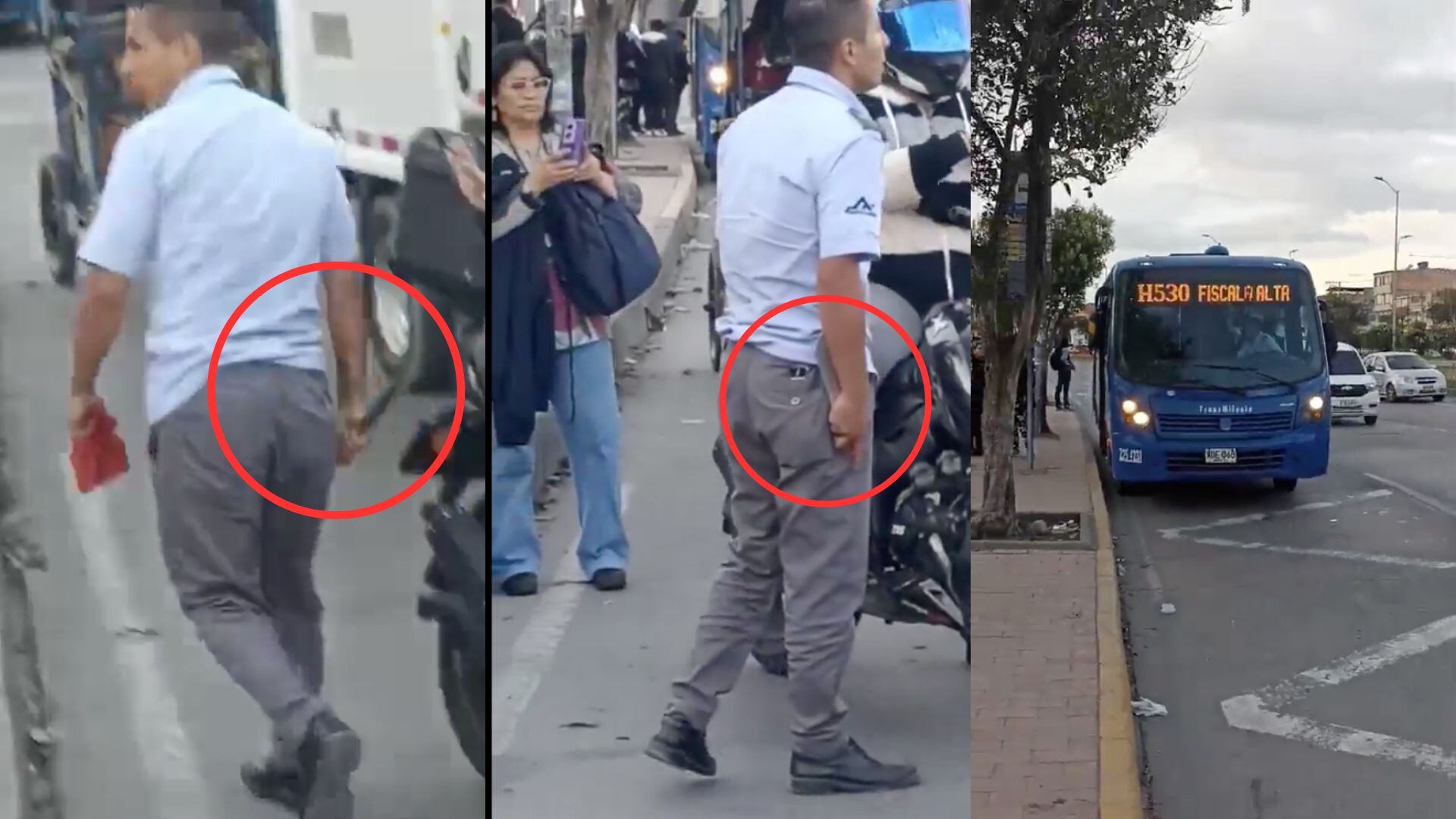 Entre tanto, el hombre que aparentemente venía manejando la moto sigue reclamándole al conductor del Sitp, quien luego sale corriendo en dirección a su bus. No obstante, poco después intenta regresar y arremete con su cuchillo, para finalmente dejar la escena y subirse al puesto del conductor en el bus.