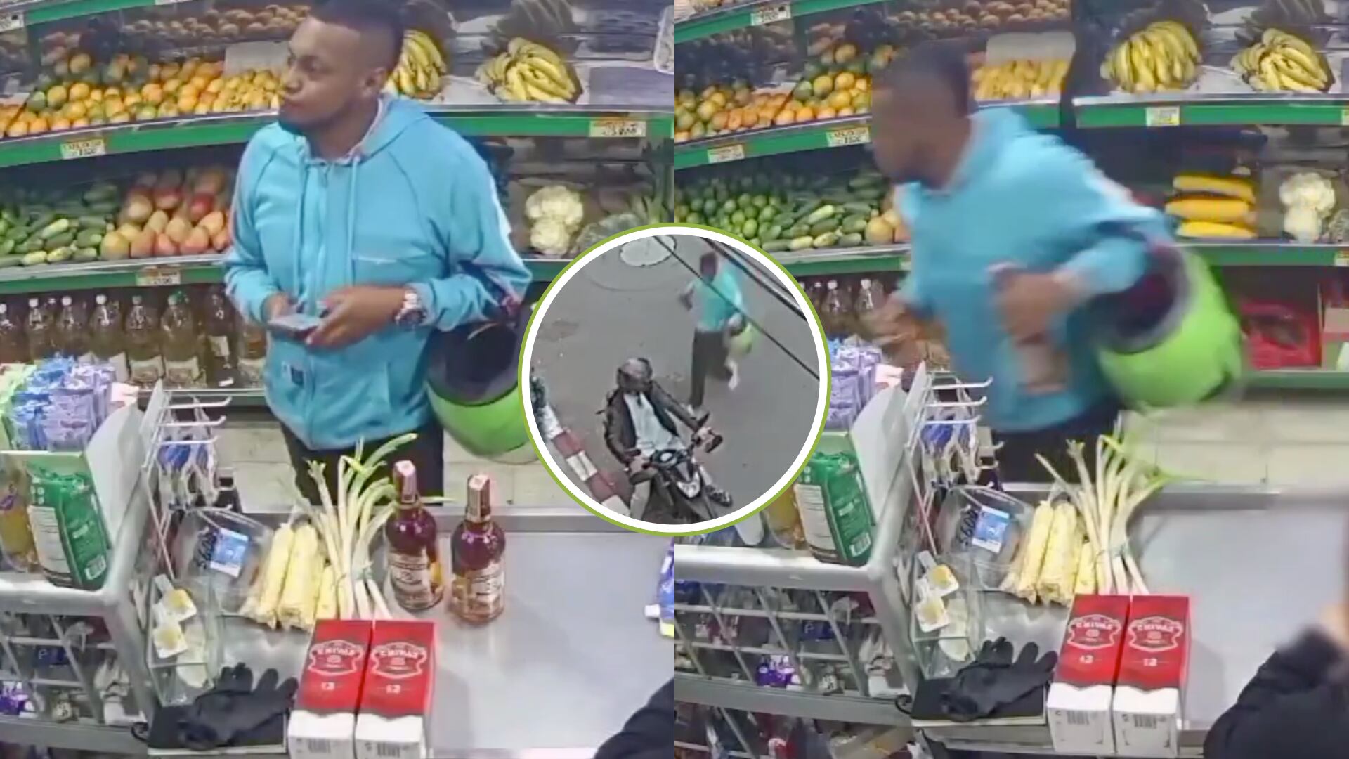 Luego, guarda el celular, ‘se hace el bobo’, agarra ambas botellas y sale corriendo de la tienda. El vídeo deja ver que tanto la cajera como quien sería el dueño del local intentan atrapar al delincuente, sin saber que afuera de la tienda había un motociclista listo para emprender la huída tras cometida la fechoría.