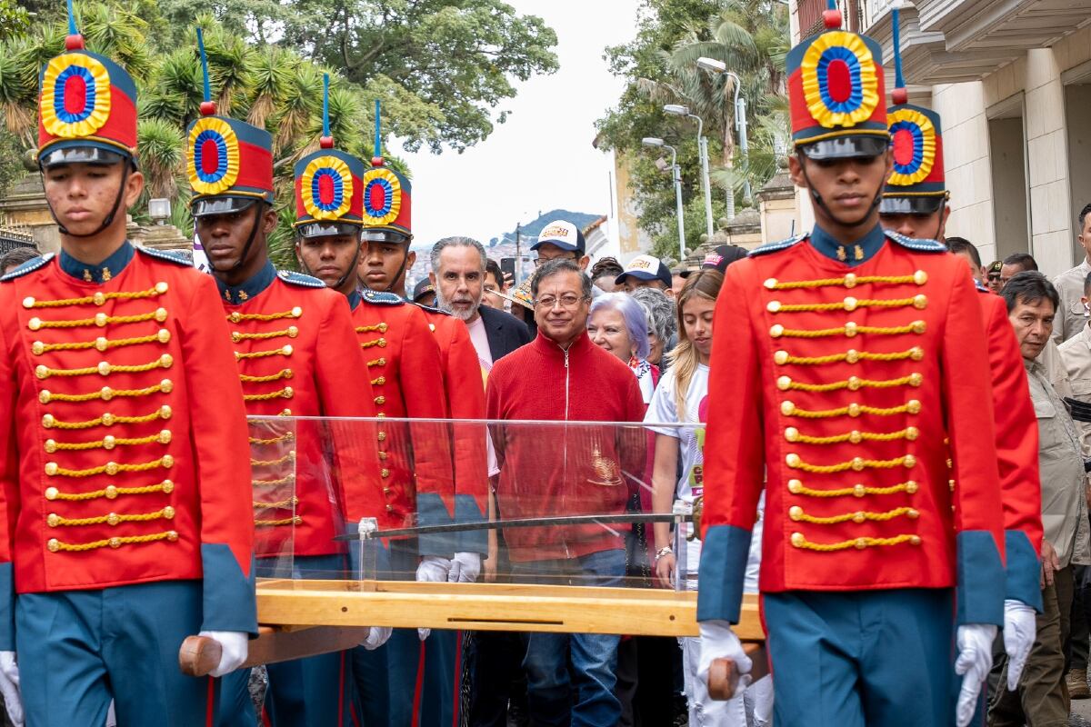 Uno de los momentos más esperados del día fue la intervención del presidente Gustavo Petro, quien lidera un ambicioso proyecto de consulta popular compuesto por 12 preguntas clave, centradas en temas como la reforma laboral en Colombia. Como había sido anticipado, el mandatario hizo una aparición simbólica con un fuerte componente histórico y político: movilizó nuevamente la espada de Simón Bolívar, emblema de su gobierno desde la posesión en 2022.